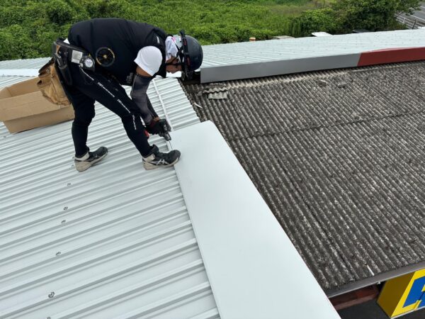 古い屋根材(波型スレート)の上に、新しい屋根材(ガルバリウム鋼板)を取り付けます。