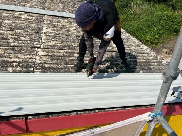 古い屋根材(波型スレート)の上に、新しい屋根材(ガルバリウム鋼板)を取り付けます。